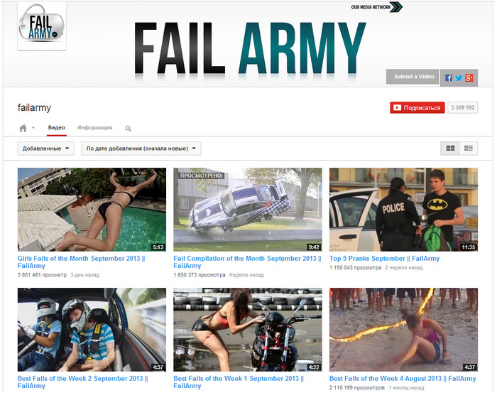 With more than 3 million subscribers FailArmy is the worldwide leader in fail compilations. FailArmy releases weekly, monthly, and specialty compilations featuring all of the web's funniest fail video content, mashed together just for your guilty viewing pleasure. If you have an epic fail video that you would like to see featured on FailArmy, click the 'Submit a Video' button at the top of the page. For more updates, don't forget to connect with us on Facebook and Twitter! FailArmy is a ChiWay Entertainment property. ChiWay Entertainment is a full-service digital media company specializing in licensing, production and video monetization. For information regarding media licensing or copyright protection, please contact: licensing[at]chiwayentertainment.com For information regarding business, press materials, advertising rates, or sponsorships, please contact: media[at]chiwayentertainment.com